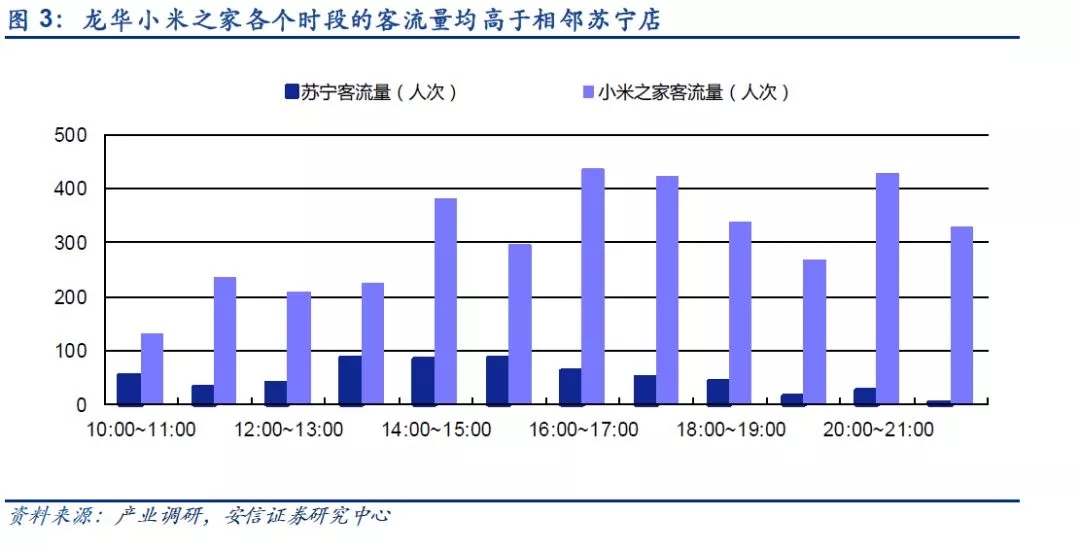 小米之家客流量相对苏宁门店的超越,可以说是“完胜”。不论是在龙华(深圳关外),还是在南山(深圳关内),亦不论是在哪个时间段(调研门店的营业时间均为10:00~22:30),小米之家的客流都明显高于附近的苏宁门店。我们注意到,12月31日晚上有跨年活动,小米门店的客流量在当晚20:00之后持续上升,但在周边的苏宁门店并未观察到这一现象。