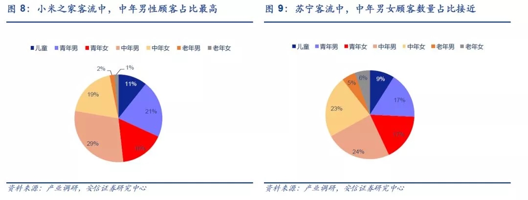 小米之家与苏宁门店的主力客流都是中年人,但二者的性别构成不一样。在苏宁门店的客流中,男女大约各占一半,绝大部分消费者以伴侣的形式逛苏宁;而小米之家的客流中,男性占比明显更高,尤其是中年男。