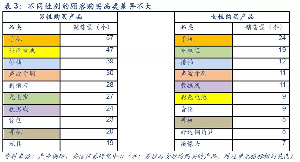 2)除手机外,卖得好的是单价低的产品。排插(19.9~99元)、彩色电池(9.9元)、声波牙刷(39.9~199元)的销量不错。相比之下,无人机、望远镜这些单价高的科技类产品、售价1万元以上的电视,都无人问津。