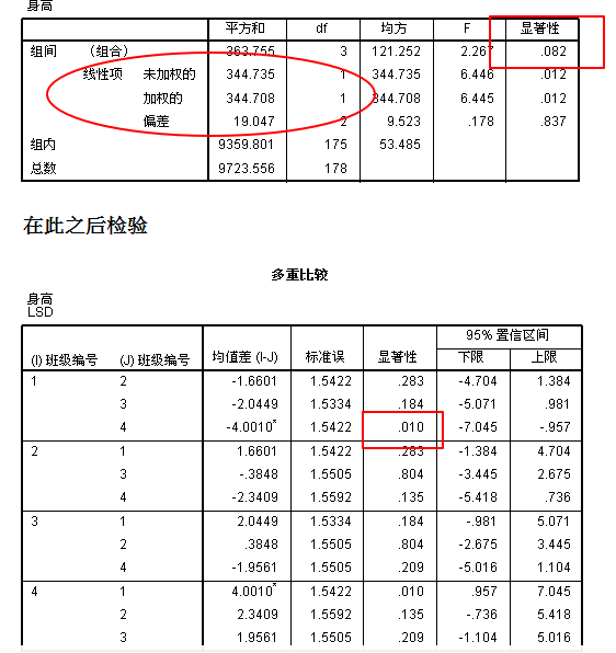 2、如图中方框,结果中组间大于0.05,说明各组没有显著性差异;而组1和组4小于0.05,有显著性差异。请问这是不是矛盾了?该如何理解?