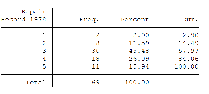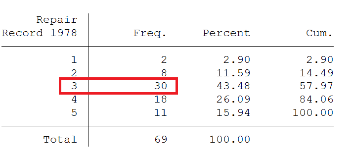 *从上表的输出结果可以看出,rep78的众数是3,对应的频数是f_max=30;
