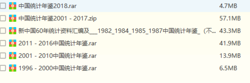 附件内容基本一样,分别是网盘分享链接与zip格式,内容都是 1982-2018中国统计年鉴。由于100Mb上传限制,zip版有一定精简(但不会有数据丢失的情况)。