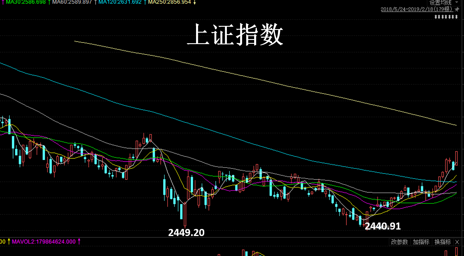 低估值加上政策底,一般来说,市场都不会差到哪里去?(因为已经很差了,上证指数2018年跌破了2500点,创业板指破了1200点,都是屡创新低。)在这种情况下,股市要起来,就看市场底的确定了,“市场先生”往往是非理性的,总会矫枉过正,但每次“过了”之后,又会慢慢恢复冷静,继而走出市场底。上证指数在2018年10月19日,创出2449.20的低位,数月之后,在2019年1月4日又创出了2440.91的低点(如下图)。之后,开始一路上涨,并且不断呈现放量态势,基本上确定双底确立,市场已经走出了市场底,我认为大概率不会再创新低。