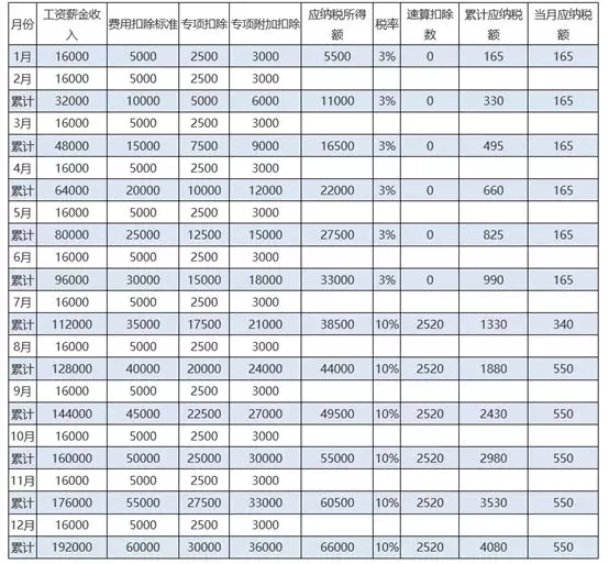 1月累计预扣预缴应纳税所得额=累计收入-累计免税收入-累计减除费用-累计专项扣除-累计专项附加扣除-累计依法确定的其他扣除=16000-5000-2500-3000=5500元,对应税率为3%。