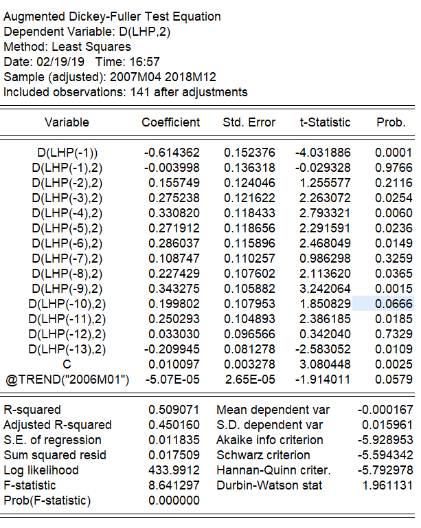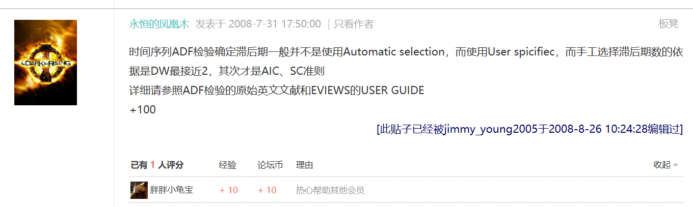 其次是之前在本论坛看到过有这样的说法“时间序列ADF检验确定滞后期一般并不是使用Automatic selection,而使用User spicifiec,而手工选择滞后期数的依据是DW最接近2,其次才是AIC、SC准则“,据此手工调整了滞后期,得到了下表第三行结果,不知道这个是否是常用方法,有没有更多的依据呢?