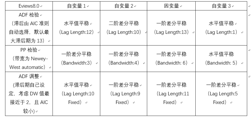 我用Eviews8.0用对四组时间序列数据(月度的)分别做ADF检验和PP检验,滞后期和带宽自动选择的情况下出来的结果如下表前两行所示。论文里一般ADF和PP结果不同时,采用ADF的检测结果,但是ADF做出来数据不同阶,无法继续做协整,请问这个怎么办?