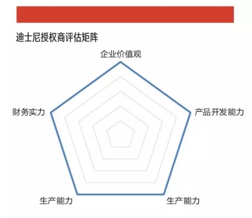 林家文介绍道,迪士尼通常会从5个角度去评估授权商的能力和资质:第一,授权公司的管理层对行业和市场的了解有多深,以及企业的价值观是不是和迪士尼相符。第二,授权公司的产品开发能力,如果它自己本身的开发能力不足,无法与迪士尼联合开发很有特色的新产品。第三,授权公司的销售能力,它是做批发还是直营,以及能否在电商平台上做多种渠道的销售。第四,授权公司的生产能力,迪士尼公司对产品质量有很高的要求,合作前会检查授权公司的每一家工厂,不仅检查授权公司生产产品的质量,同时也考察授权公司的生产环境和流程是否符合环境法规和劳动保护的要求。第五,授权公司的财务实力。管理层和产品的开发能力也是优先考虑的重点因素。(见图“迪士尼授权商评估矩阵”)