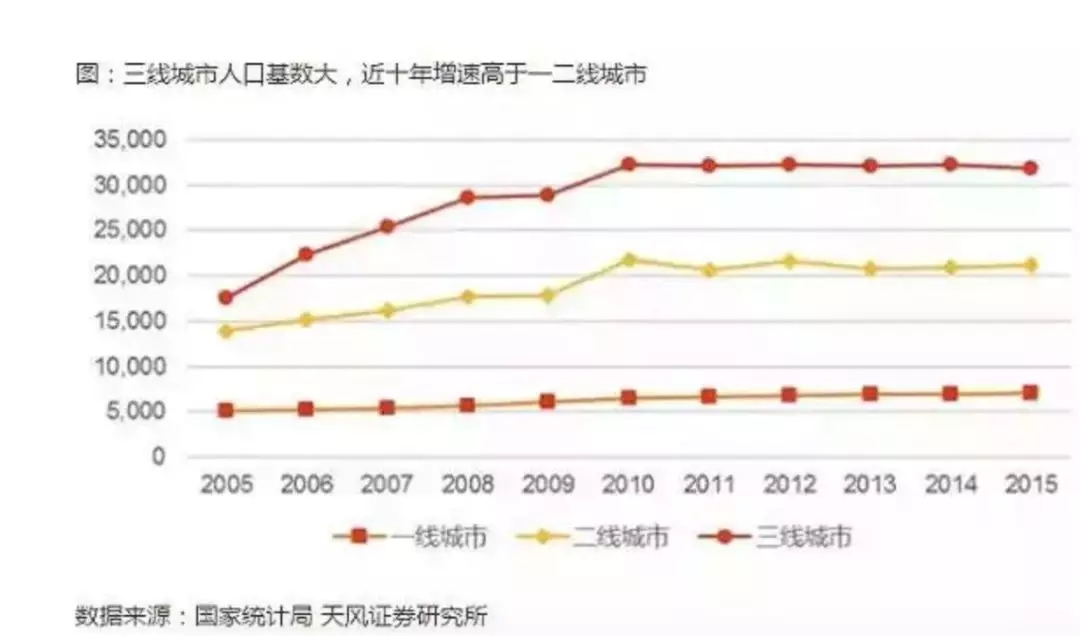 从人口的角度看,三线城市总人口增长明显比一二线城市迅猛,近十年来翻了一倍。目前三线城市的人口数,是一线城市的6倍左右。