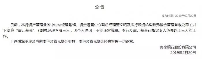 今日,南京银行发布公告称,日前,资产管理业务中心总经理戴娟、资金运营中心副总经理董文昭及本行投资机构鑫元基金管理有限公司副总经理李雁三人,因个人原因,不能正常履职。