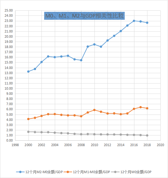 由趋势线可知,12个月M2-M0余额/GDP从13倍递增至23倍,12个月M1-M0余额/GDP从4倍递增至6倍,12个月M0余额/GDP从1.65倍递减至0.96倍,该期间,中国经历了由流动性过剩到流动性不足,以及GDP增速显著放缓的过程。因此,M0与GDP相关性最高,这就从定量上证明了货币流量为M0,并非M1或M2。