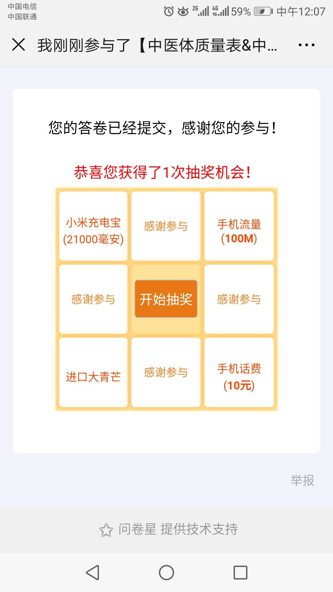 无需关注,扫码即可参与关于中医体质的问卷调查,调查完成后有系统的随机抽奖,另外,因论坛币有限,为感谢大家参与调查(需要300余份),所有参与者奖励20个论坛币,请完成后上传抽奖的手机界面全屏截图(如下图所示)并设置论坛币价格,我这边随时点击购买,谢谢!