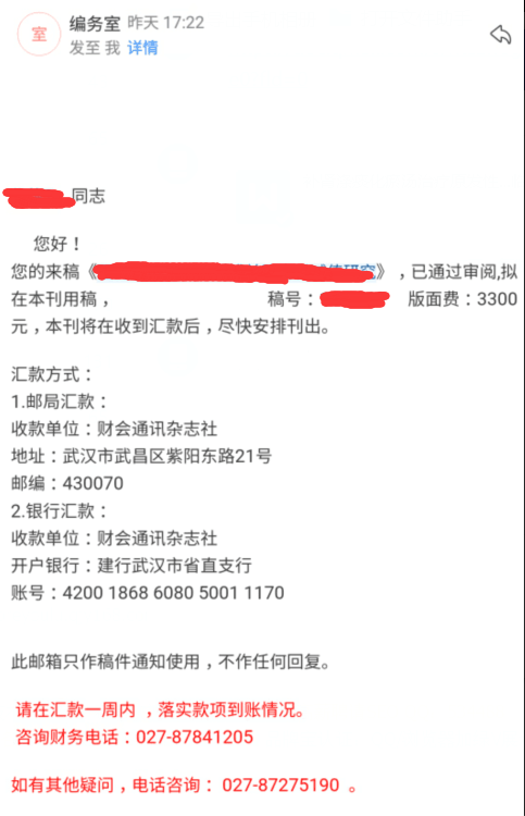 xnytaddd 发表于 2019-2-25 00:14 干财务工作多年,单位有评职称的要求,昨天收到录取邮件还是很开心的,不过版面费有点贵! 发帖纪念下,毕 ...