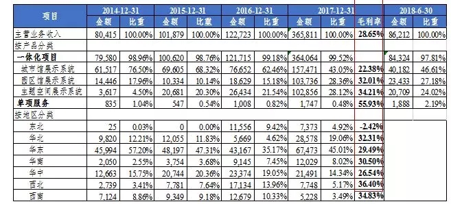 从公司营收结构来看,公司的业务重点从毛利率较低的城市馆展示系统转向毛利率较高的主题空间及园区展示系统业务。城市馆展示系统营收营收占比逐年下降,主题空间及园区展示系统营收趋于上升,公司业务结构不断优化。2014-2018年1-6月,公司的城市馆展示系统营收占公司总营收比例分别为 76.50%、68.32%、62.46%、43.05%、46.61%,下降趋势明显;园区馆展示系统、主题空间展示系统营收占比分别由 2014 年的 17.96%、4.50%,上升至 2018 年的27.18%、24.02%,两者营收占比不断扩大。2017 年公司城市馆展示系统、园区馆展示系统、主题空间展示系统毛利率分别为 22.38%、32.01%、34.21%,由于园区展示系统和主题空间展示系统毛利率更高,这将会提升公司整体毛利率。