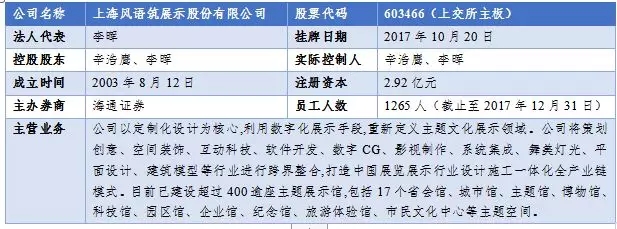 公司成立于 2003年,初期从事广告业务,公司创始人及其团队原主要从事建筑规划领域内专业模型设计制作。2008年,公司专注从事展览展示空间的设计与实施业务,重点扩展城市馆、园区馆展示系统领域的经营方向;2010年,上海世博会后,展览展示行业需求迅速增长,公司获得良好的发展机遇快速发展;2017年10月登陆上交所上市,是业内首家在主板上市的公司,公司在城市馆和园区馆展示领域已形成较强的竞争优势,2017 年在城市馆和园区馆展示领域的累计中标金额达 15.76 亿元,占中标总金额的 50.26%,稳居行业龙头。