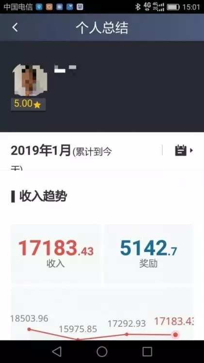 今年春节期间的2月3日,一位滴滴司机晒出了自己的收入截屏,其2019年1月的总收入达17183.43元,而奖励收入高达5142.7元。