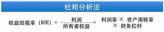 从“所有者权益”到“利润”,是一个通过“所有者权益”撬动了“资产”,又撬动了“收入”,再得到“利润”,这么一个循环的过程。但是对于我们所有者来说,最重要的是考虑我投了这100万进来,我到底赚了多少钱。也就是说,投资者最关心的是权益回报率又叫做ROE,就是下面的这个公式,权益回报率=利润÷所有者权益。经过一系列指标的换算之后,权益回报率=利润率×资产周转率×财务杠杆。这套方法非常有名,所有做财务分析的人都知道这套方法,叫做杜邦分析法。