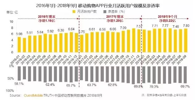 拼多多用户总量增长缓慢,同时移动购物用户规模增长率下降,如图: