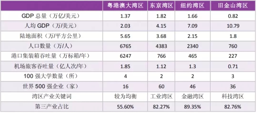 粤港澳大湾区经济总量超过了旧金山湾区,略逊于东京湾区和纽约湾区。在人口数量上,粤港澳大湾区要远远超过其他湾区,在人均GDP上还有很大提升空间。另外拥有广州、深圳、香港三大世界级港口的情况下,粤港澳大湾区的港口集装箱吞吐量也要高出其他湾区一个段位。