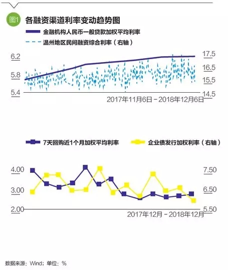金融根植于实体经济,服务于实体经济。从实体融资结构来看,中国实体经济融资渠道包括两类:第一类是股权融资;第二类是债务融资,主要包括银行信贷市场、债券市场、表外影子银行和民间借贷体系。股权融资成本主要包括律师费、审计费等相对固定的费用,变化不大,而债权融资成本高主要高在债务利息上。而实体经济融资成本是微观经济运行效率的宏观指征,短期内融资成本易上难下,解决融资难、融资贵的僵局并非易事。从结构上看,实体融资成本表现出“借贷利息高、货币利率低;民营小微高、大型企业低”的特点,主要高在银行信贷和民间借贷体系。截至三季度末,人民银行发布的金融机构人民币一般贷款加权平均利率为6.19%,较上年末(5.8%)上升39个基点。截至11月末,温州民间融资综合利率为16.1%,较上年末(15.1%)抬升了103个基点。与此同时,11月底反映货币市场资金价格的7天回购近1个月加权平均利率和代表大型企业发债融资成本的公司债月度加权发行利率分别为2.72%和6.54%,较年初分别下降了56和70个基点。从经济基本面来判断,实体融资难、融资贵的问题短期内还将持续,须坚持供给侧结构性改革,鼓励金融回归本源的同时,政策、银行和企业层面“三方发力”,形成金融与经济的新的良性循环。