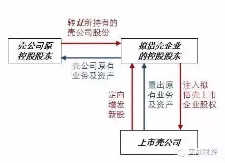 1、上市壳公司将全部业务和资产转让给拟借壳企业的控股股东,并同时向其增发新股,换取其所持有的拟上市企业股份;