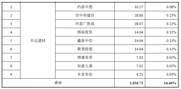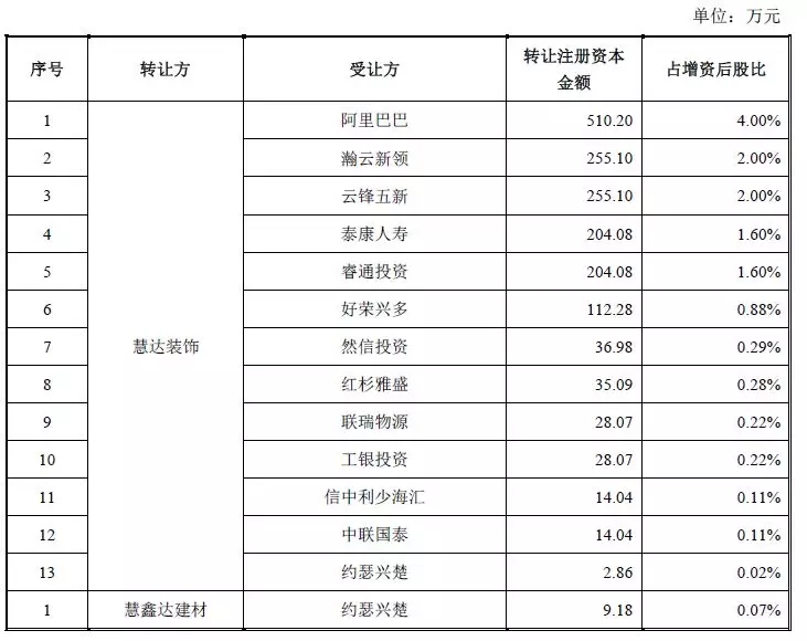 同时,老股转让14.4%的股权,据披露慧达装饰、慧鑫达建材和兴达建材分别向阿里巴巴等21名投资者转让股权,具体股权转让情况如下: