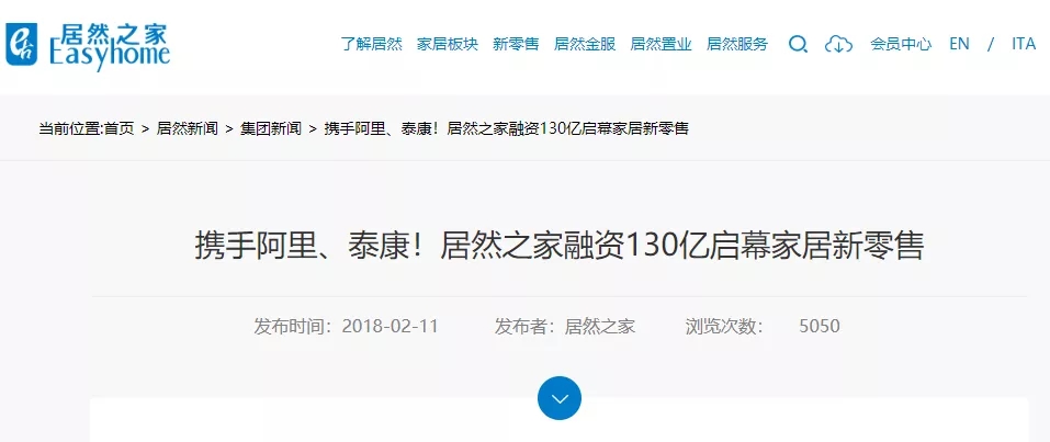 2018年2月,居然之家发布信息《携手阿里、泰康!居然之家融资130亿启幕家居新零售》