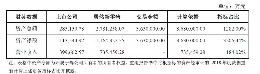按照本次交易初步确定的价格区间的下限363亿元进行测算,居然新零售2018年10月末未经审计的资产总额、资产净额及2017年度营业收入占上市公司2017年年末/2017年度经审计的合并财务报表相关指标的比例如下:
