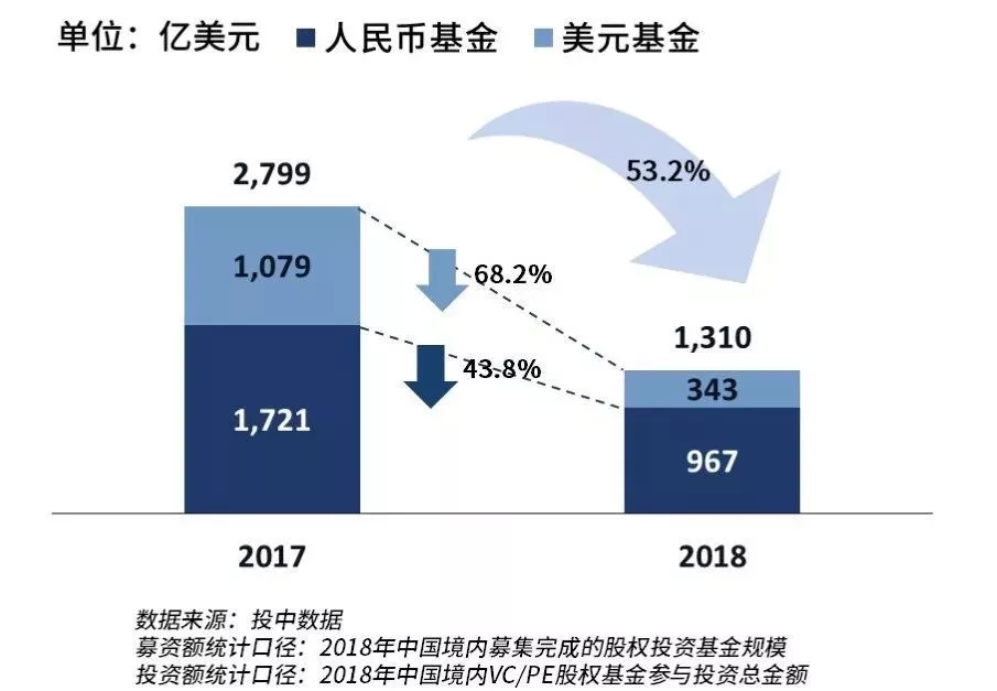 截至到2018年12月31日,中国股权投资市场人民币募资总额为967亿美金,同比下降43.8%;美元基金募资总额为343亿美元,同比下降68.2%;人民币加美元全部资金募资总额较2017年同比下降53.2%。