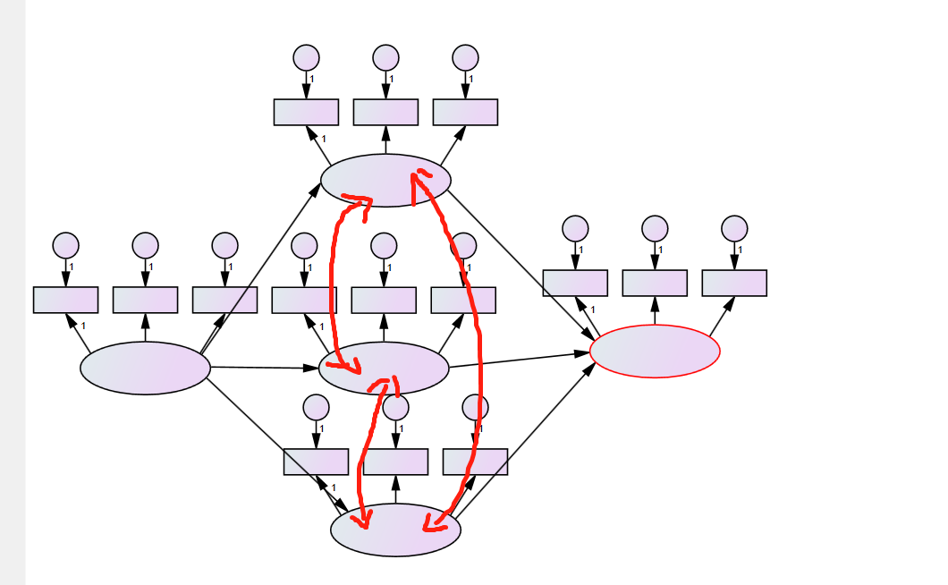 想要建一个如下图的模型(怕太乱没画内因变量上的误差变量),需要让中间一列内因潜变量之间两两相关(为了和另外的模型进行比较)。看文献的时候有人用Mplus实现了内因变量的相关,但AMOS上,无法连这个双箭头。想问一下有什么办法吗?还是说AMOS就是不允许这种情况?