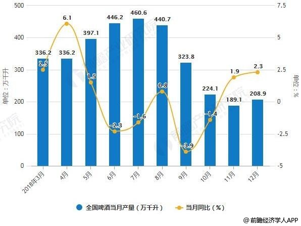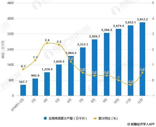 2018年全年全国啤酒产量超3800万千升。据前瞻产业研究院发布的《中国啤酒行业品牌竞争与消费需求投资预测分析报告》统计数据显示,2018年1-3季度全国啤酒产量逐渐增长,2018年3季度全国啤酒产量相比1季度增长321.2万千升,增长35.53%。2018年12月全国啤酒产量为208.9万千升,同比增长2.3%。2018年1-12月全国啤酒产量为3812.2万千升,同比增长0.5%。