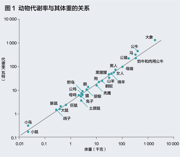 先让我们来说说规模法则是什么。首先介绍一下新陈代谢率,它是指能提供一天所有活动的总能量(人大概每天需要200卡路里)。在用对数相对于体重绘制时,新陈代谢率以人们可以想象到的最简单的方式随着体重的变化而按比例变化,它成了一条直线,表明了简单的幂律规模法则关系(如图1)。