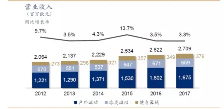 2017财年安踏营收20.99亿欧元,Amer营收27.09亿欧元,但安踏的增长更迅猛,2017财年Amer营收增长3.3%,安踏营收增25.1%。同年安踏的调整后EBITDA(税息折旧及摊销前利润)利润率为25.4%,也远高于Amer的10.5%。