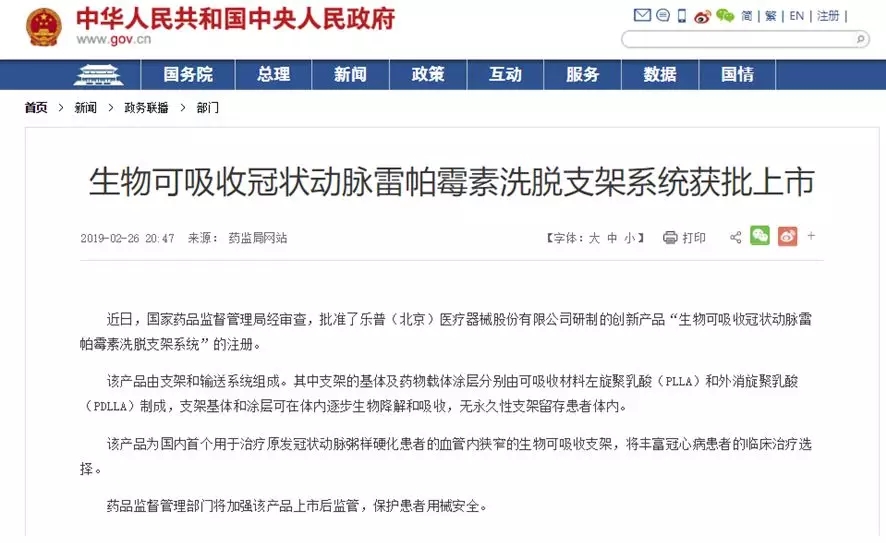 2月26日,国家药监局发布准产批件通知,乐普医疗的生物可吸收冠状动脉雷帕霉素洗脱支架系统(NeoVas)正式通过审批,成为国内首款获准上市的生物可吸收支架。该产品作为近年来心血管领域内最具价值的研发成果,此次获批无疑将锁定本年度医药创新的头魁,提前扼杀悬念。