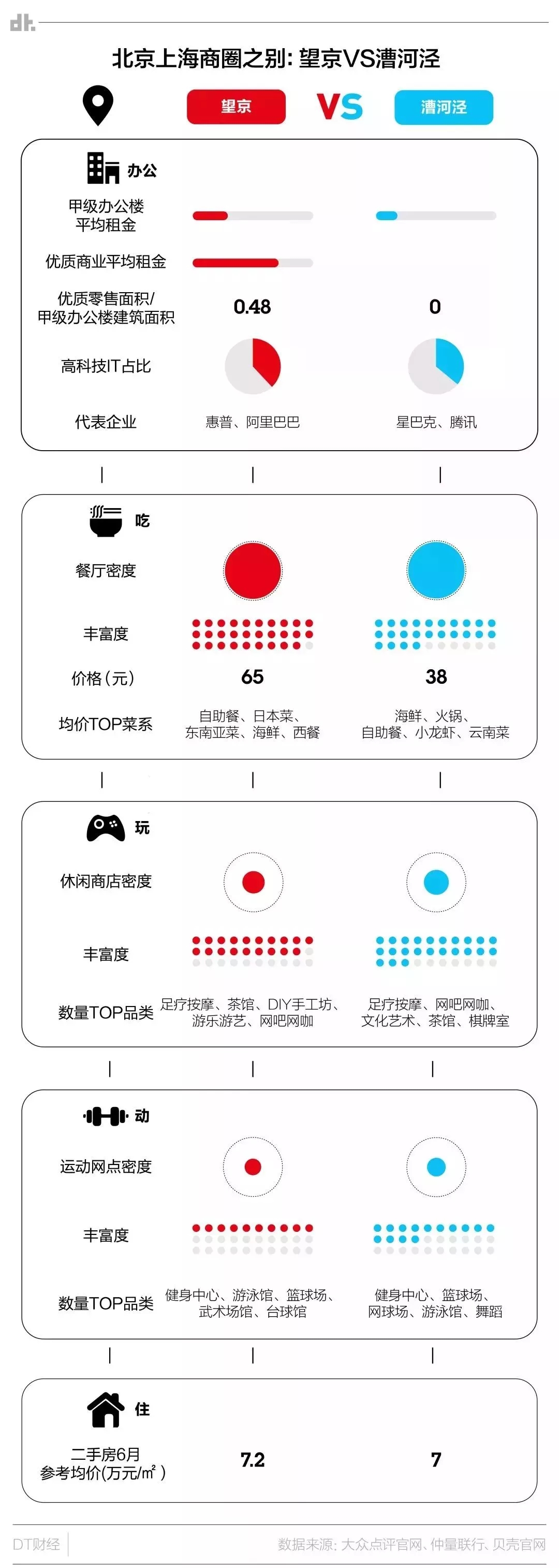 不过也有差异之处,例如国贸的平均工资比南京西路高了一些,二手房均价却便宜不少。在吃、玩、运动这三个板块中,国贸都略逊南京西路一筹。