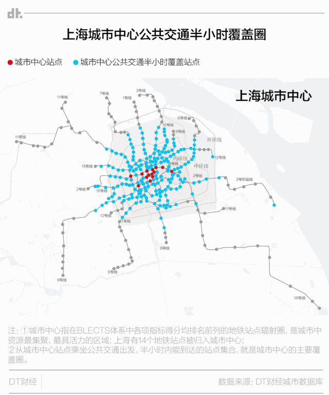 从交通覆盖图上来看,各个中心的辐射范围也是基本一致。例如南京东路站与徐家汇站的辐射范围有近半重合,它们都跨越了几条环线。