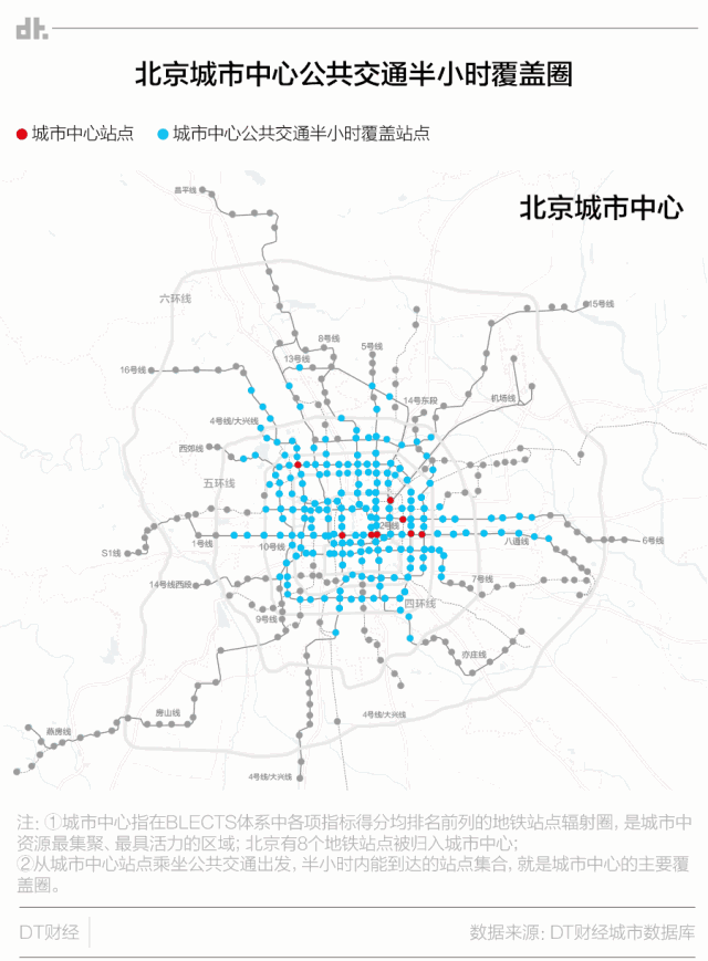 我们还可以看看北京8个城市中心站点的公共交通半小时覆盖圈。