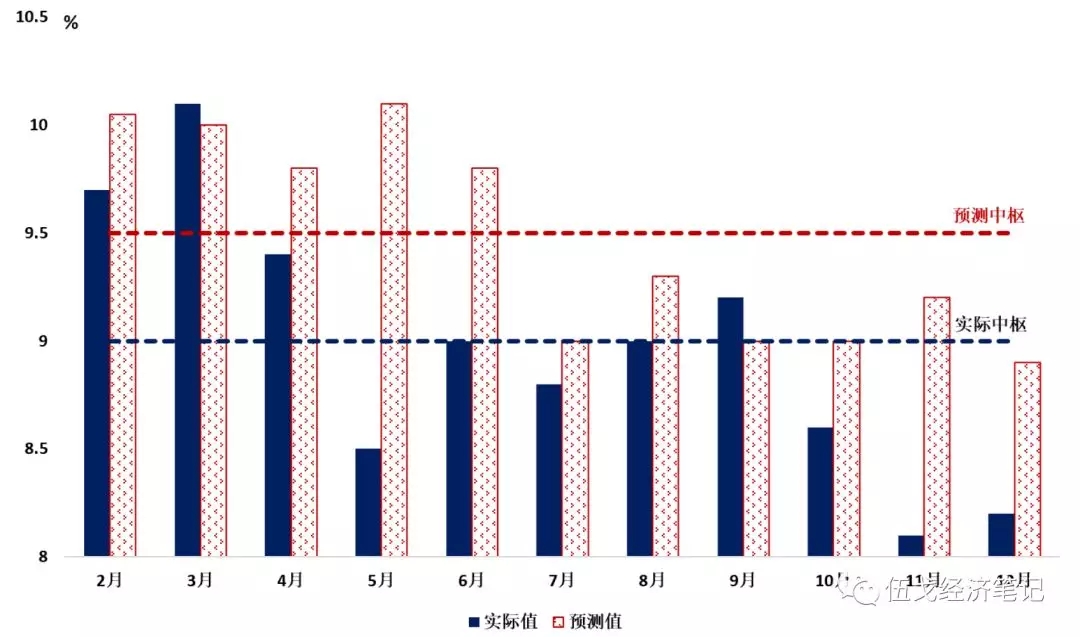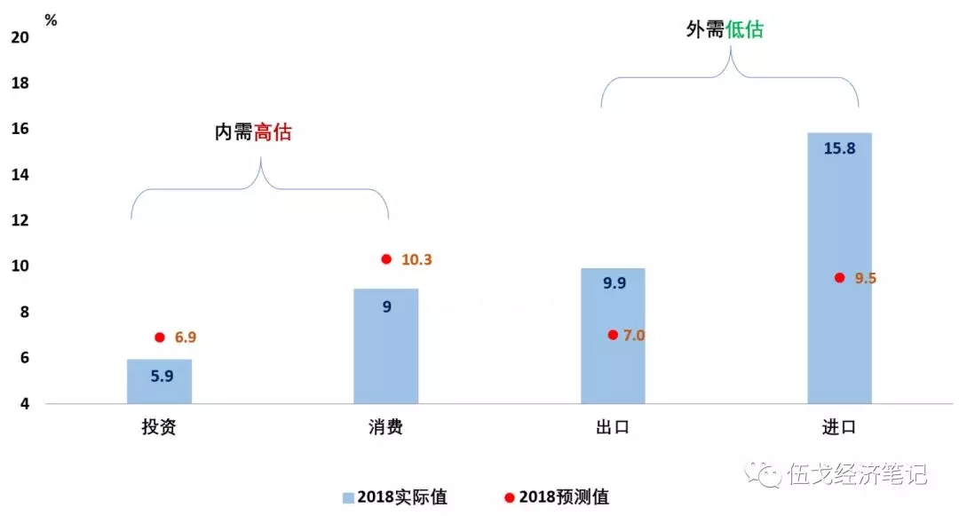 从投资来看,虽然2018年房地产投资韧性犹存且制造业投资增速有所回升,但市场没有捕捉到紧信用下基建增速的超预期下滑(由2017年19%降至2018年3.8%),从而造成了投资增速中枢的高估。