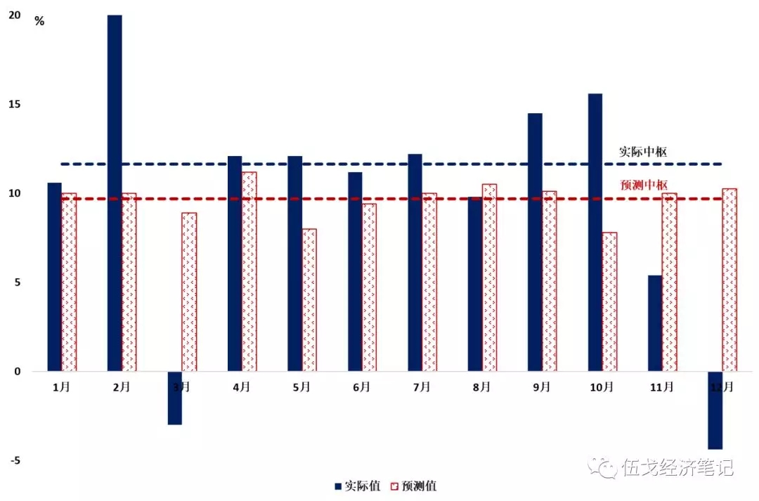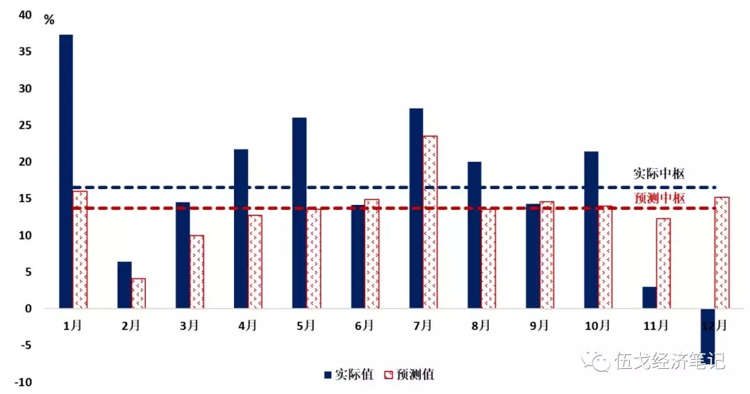 注:2月出口实际值为43.5%,由于显示原因,我们略去其高于20%的部分。