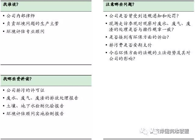 评估公司所面临的环保问题,确保公司没有违反环保条例,确保公司不会受环保问题导致的诉讼;清理环保问题的成本可能是极其昂贵的,可能会导致公司的名誉损失,也可能导致歇业的严重后果。