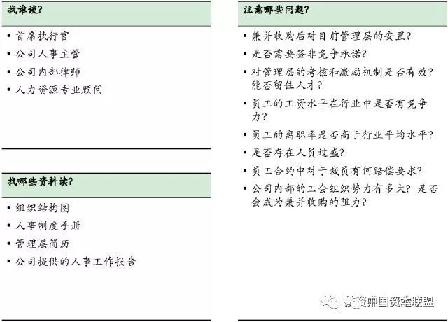 理解目前的人事制度、人力资源结构,确保没有对社保机构拖欠员工福利,提前为兼并收购带来的人事变动做好准备。