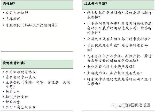 确保公司依法成立并拥有经营其业务的营业执照,找出任何实际的和潜在的法律诉讼;法律风险可能会影响财务(例如赔偿损失)甚至于直接影响业务(例如停业整顿或回收已销售产品等)。