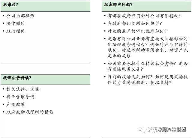 理解公司所处的政治和监管环境,理解兼并收购所涉及的审批程序,以便及早开展游说工作、获得支持、降低获准审批的不确定性。