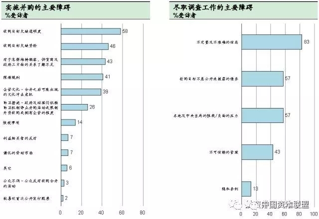 《经济学人信息部》近期的一项对中国并购近况的调查显示目标企业缺乏透明度以及缺少目标企业的相关信息是实施并购的主要障碍;而尽职调查工作方面存在的主要的障碍在于信息不完整不准确及收购目标未披露债务实际情况;调查显示外国企业更多地依靠对目标企业开展尽职调查工作来发现其存在的不足和问题,这也正是它们如此重视并购进程中这一环节的原因,而中国企业的管理人士则把资产估值资料不准确甚至是存在水分视为普遍存在,对比他们并不感到意外,也不会在尽职调查方面花太多时间;事实上,提高透明度,尽可能提供完备的资料是降低双方交易成本,提升交易成功机率的最有效的方法。缩小在尽职调查上的东西方文化差异有别于进一步促进跨国并购活动的蓬勃发展。