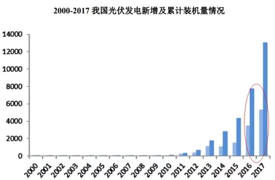 2016-2017这两年,光伏发电新增装机量剧增,其中2017年高达53GW的新增装机,让光伏行业发展再攀高峰。