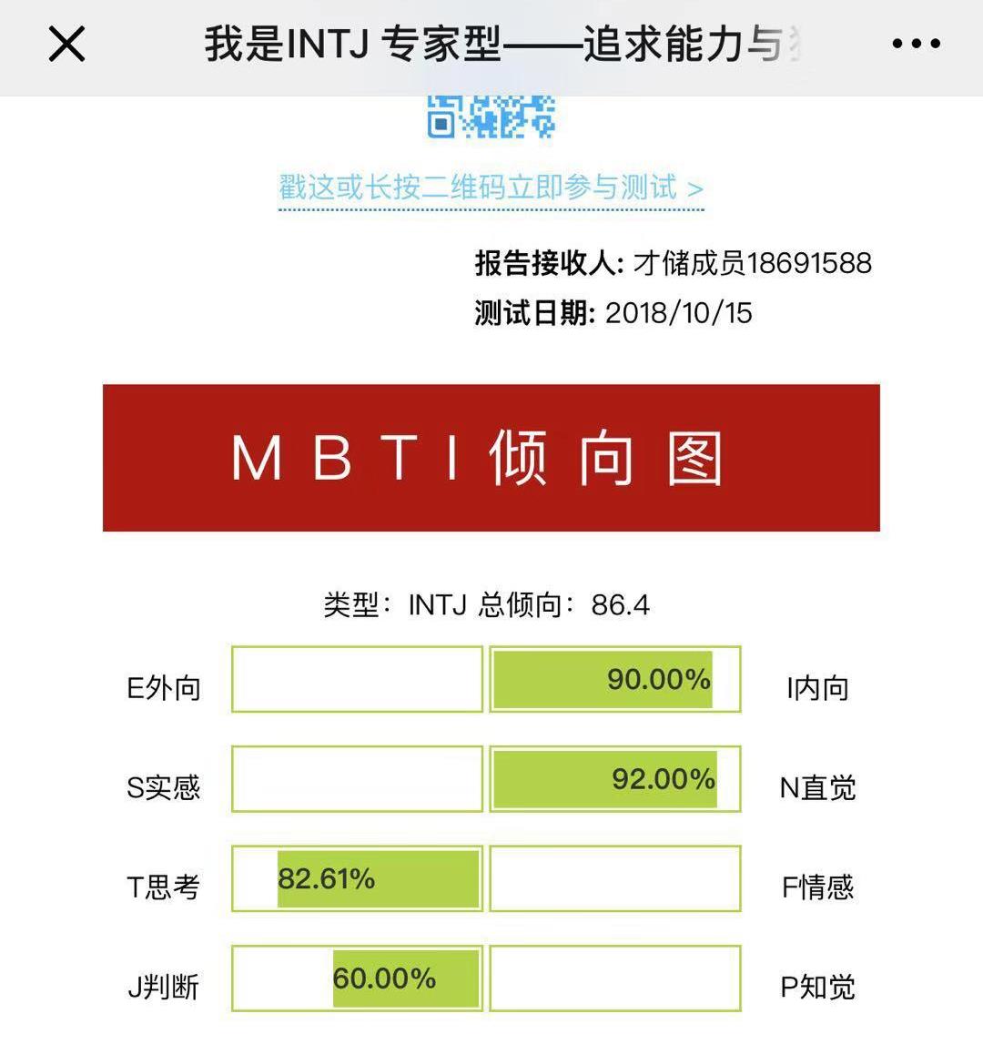 我的才储的分析为:“性格类型倾向为“ INTJ ”(内向 直觉 思维 判断 倾向度: I95 N96 T91 J80 不假思索指数:15)” INTJ的分析文章是这样写的,“INTJ的使命就是改变世界。”物理学家牛顿,经济学家凯恩斯,程序员扎克伯格,发明家特斯拉,思想家萨特,物理学家霍金,企业家马斯克都是INTJ。我希望自己也能改变世界,我的方法是研究世界,为世界提供理论支持,就像牛顿发现牛顿力学一样。