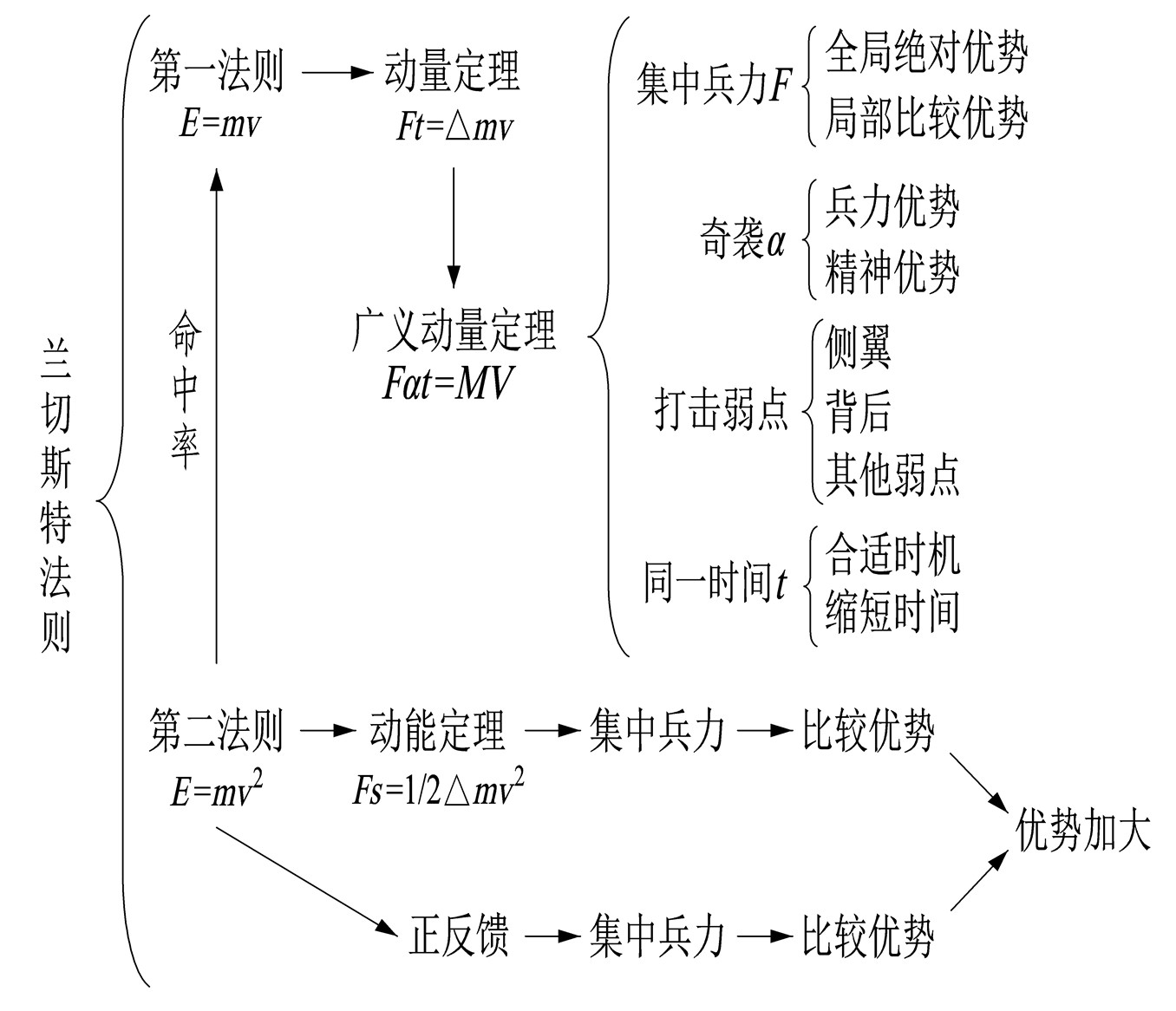 战争的基本原则为:集中优势兵力F,使用正奇作战方式(方向α),在同一时间t,打击敌人的弱点(作用点),从而使兵力的对比优势逐渐扩大,形成正反馈效应,最终以最小的代价获得最大的成果。