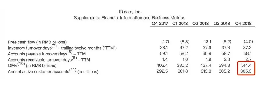 截至2018年12月31日,京东的年度活跃用户数为3.053亿,第三季度京东年活跃用户数为3.052亿,较上季度年活跃用户数增长仅10万,环比基本持平,不过较上季度该指标“首次出现环比下降,减少了860万”的情况已经出现扭转。