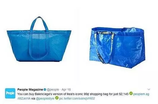 宜家蓝色购物袋只要几块钱,与它相似的巴黎世家Arena超大号购物手提包售价2145美元(约14775人民币)。