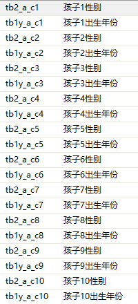 tb2_a_c1 tb1y_a_c1……tb2_a_c10 tb1y_a_c10分别表示第一个子女的性别、第一个子女 ...