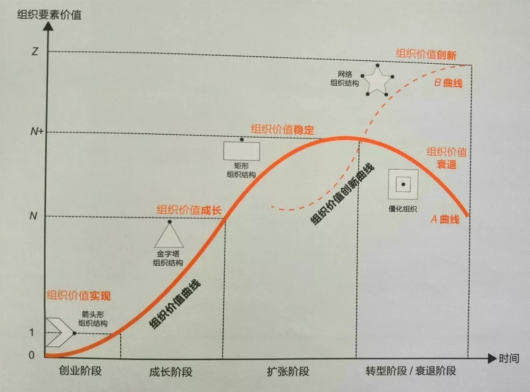 然而,随着企业业务的不断扩张,各事业部和各部门的交叉支持可能变成盘根错节,官僚化倾向出现并越来越严重,造成组织效率的持续下降,企业可能随之进入组织价值衰退期。